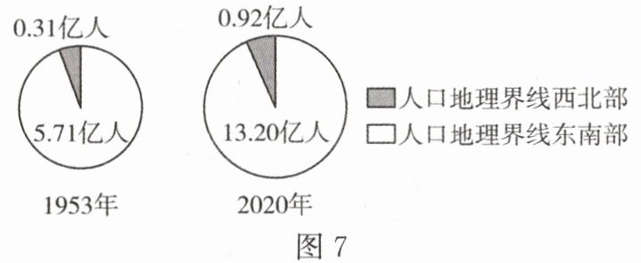 17. 人口普查有利于了解我国人口基本国情。图6是依据第七次全国人口普查绘制的部分省级行政区人口数量及人口增长率(2010—2020年)分布图,图7是我国人口地理界线两侧不同时期的人口数量对比图。读图,完成下列各题。