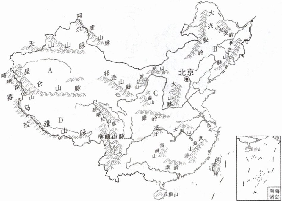 )A. 天山山脉、阴山山脉、秦岭 B. 阿尔泰山脉、祁连山脉、巫山C. 大兴安岭、贺兰山、六盘山 D. 长白山脉、武夷山脉、南岭