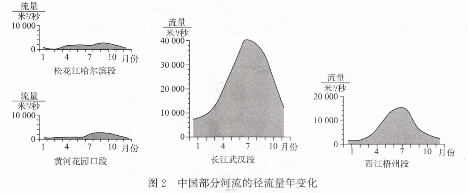2. 小宇和小亮计划清明节假期出游观察花鲈迁徙情况,计划选择松花江、黄河、长江或西江之一。请根据水文特征判断哪条河流下游花鲈种群可能最多,并结合图2说明理由。