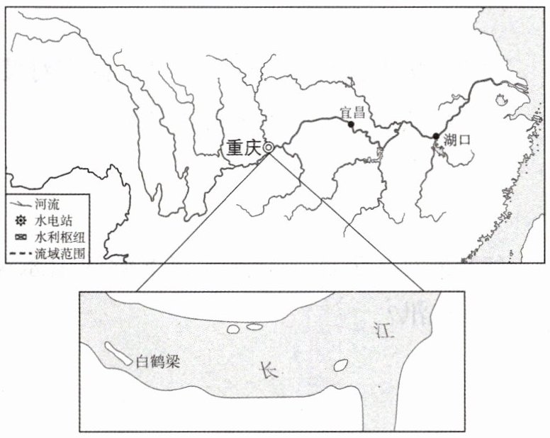 白鹤梁题刻位于长江水道中的天然石梁上,记载着唐代以来的长江水位资料,石梁一般淹没在水下,枯水季节会露出水面。读白鹤梁位置示意图,完成4~6题。