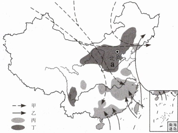 [思维过程] 1. 读图可知,图示地质灾害为泥石流,多发于西南地区,一方面这里山地广布,地势陡峭,落差大;另一方面这里降水丰沛且集中在夏季,受地形和降水的共同影响,常发生崩塌、滑坡、泥石流等自然灾害;太阳辐射强,气候炎热与泥石流无关。2. 当我们遇到山崩、滑坡、泥石流等灾害时,应垂直于流动方向往山坡上跑,尽快撤至安全地区;躲在他人身后,逆着流动方向往山顶上跑,顺着流动方向往山下跑的方式都不合适。3. 我国华北地区春季气温回升快,蒸发量大,夏季风还未到达,降水少,所以春旱严重。4. 甲为寒潮,乙为台风,丙为洪涝,丁为干旱。5. 读图可知,丙灾害为主要影响我国长江中下游地区的洪涝灾害,其多发的原因是夏季风不稳定,使得降水季节变化大、年际变化大,以及泥沙淤积河道,排水不畅;与经济发展需水量大无关。