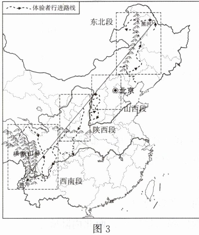 《中国国家地理》杂志社推出的“漫步中国”专辑中一条路线是“走胡线”(“胡线”即“胡焕庸线”)。路线分为四个地段:东北段、山西段、陕西段、西南段。图3为“走胡线”示意图。据此,完成7~9题。