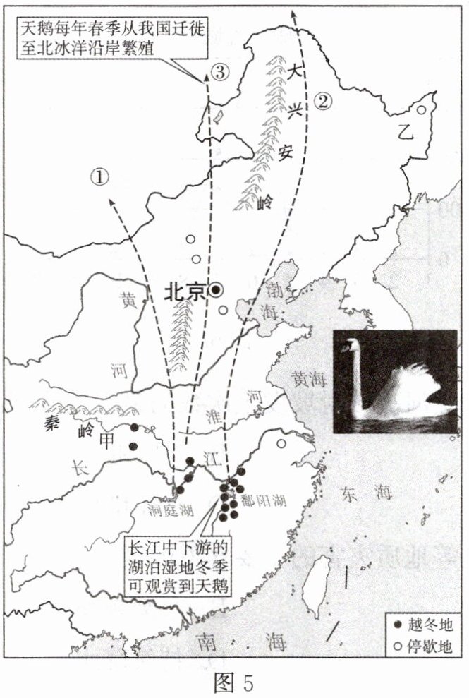 充足的食物和适当的温度是鸟类繁衍生息的最基本条件,正因为如此,鸟类才有了迁徙现象,其往返路线基本一致。图5示意天鹅在我国境内的主要栖息地和基本路线。据此,完成13~15题。