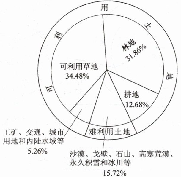 我国土地类型齐全,有利于因地制宜地发展农、林、牧、渔、工矿业生产和城乡建设。读我国土地利用类型构成图,完成 1~2 题。