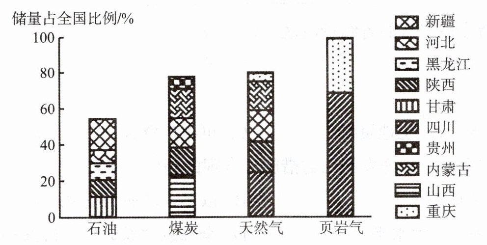 中国矿产资源种类齐全,已发现的能源矿产有 13 种,其中石油、煤炭、天然气在中国一次性能源消费构成中共占比 95%左右。读我国主要矿产资源储量地区分布统计图,完成 1~2 题。