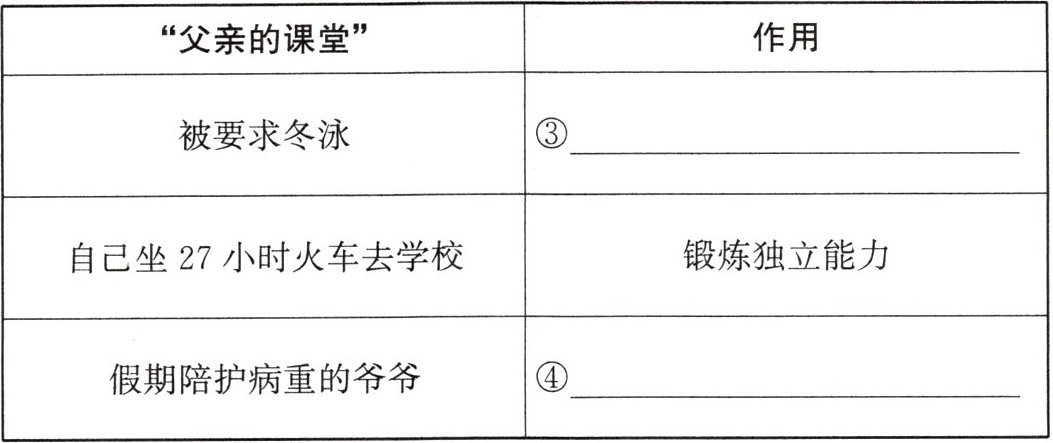 5.①锻炼心性,改掉坏习惯 ②被要求自己组装家具③锻炼耐寒能力 ④锻炼照顾人、与人沟通的能力和直面生死的勇气6.【示例】“我的筋骨会结实,我的目光会锐利,我会修山地车,会在强风中搭帐篷,会看北斗七星寻找方向,会在旷野上点燃篝火,我将会比你更耐压,更有眼光。”这个句子运用排比的修辞手法,描写了“他”不服气父亲给自己贴标签的心理,表达了对父亲的强烈不满,节奏鲜明,读起来朗朗上口。7.【示例】他应该很疼吧,我要不要安慰他一下?8.【示例】我更赞同本文中的父亲对待孩子的方式。本文父亲的教育虽然“硌人”,但可以使孩子的身体和心理都变得强健起来,使孩子受益无穷,说明父亲教子有方。