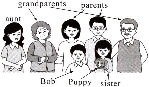 Hello, I'm Bob. Here is a nice photo of my family. My grandpa is on the right of my dad,and my grandma is on the right of my aunt. My parents are in the middle. The handsome man with glasses is my dad,and the beautiful woman next to my dad is my mum. The girl with big eyes and long hair is my sister. Who is the little boy? Haha! It's me! Puppy,the dog,is in the photo too. I love my family. We love and help each other.