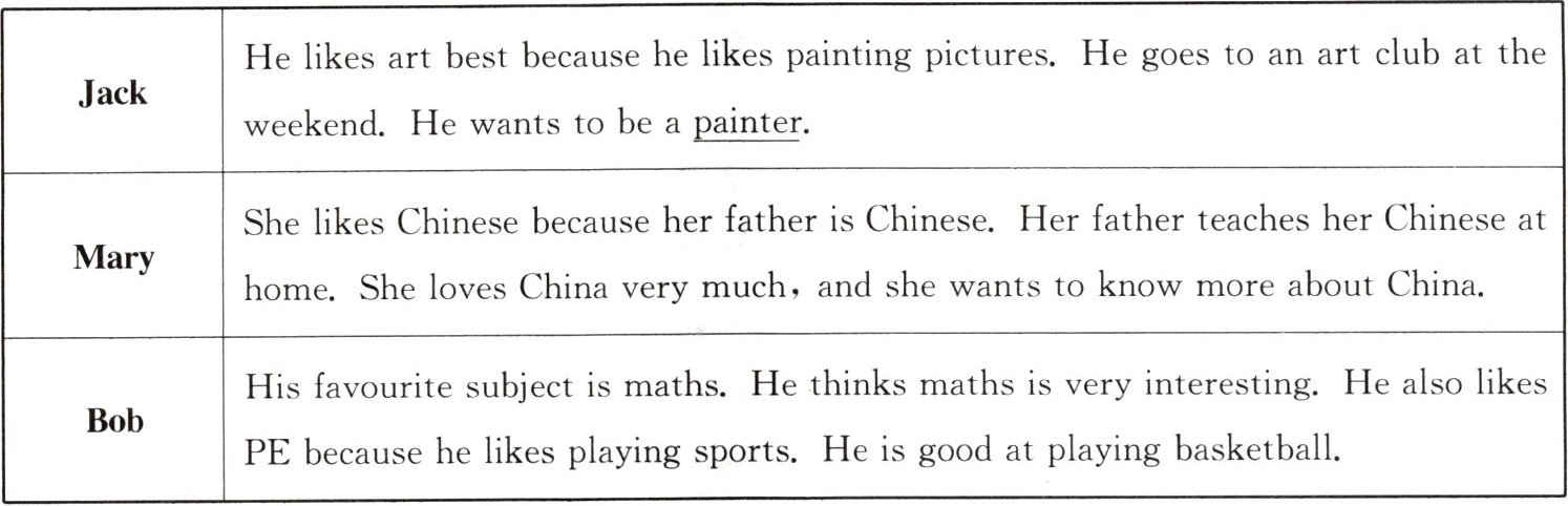 | Jack | He likes art best because he likes painting pictures. He goes to an art club at the weekend. He wants to be a painter. |