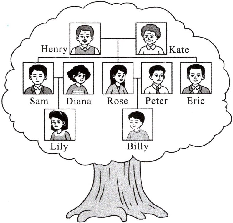 Lily is from a big family. This is Lily's family tree. Henry and Kate are her 1. ______. They have 2. ______ children. The 3. ______ of Lily's father is Sam. Diana is her mother. She is a teacher. Rose and Peter are Lily's aunt and uncle. They have a son, Billy. He is Lily's 4. ______. Eric is Lily and 5. ______ uncle.