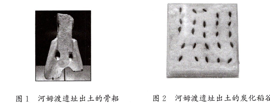 |图 1 河姆渡遗址出土的骨耜|图 2 河姆渡遗址出土的炭化稻谷|