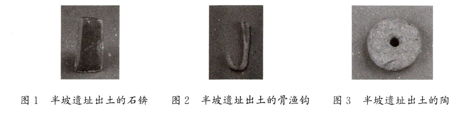 |图 1 半坡遗址出土的石锛|图 2 半坡遗址出土的骨渔钩|图 3 半坡遗址出土的陶纺轮|