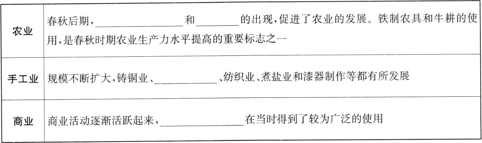 |农业|春秋后期,____和____的出现,促进了农业的发展。铁制农具和牛耕的使用,是春秋时期农业生产力水平提高的重要标志之一|