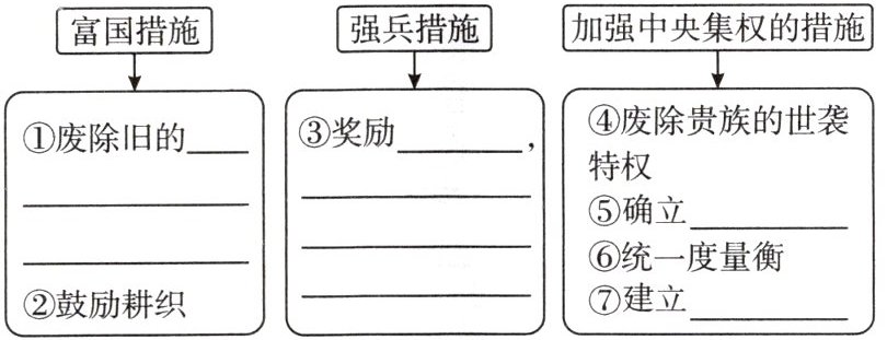(3)作用:使秦国的政治、经济、文化、社会生活面貌有了根本的改变,综合国力大为增强,提高了军队战斗力,一跃而成为最强盛的诸侯国,为以后____奠定了基础。