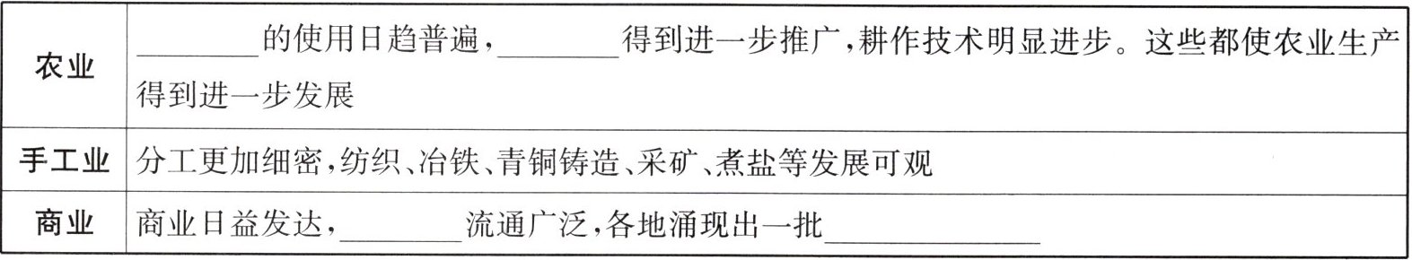 问题 5 列举战国时期农业、手工业和商业发展的表现,完成下列表格。