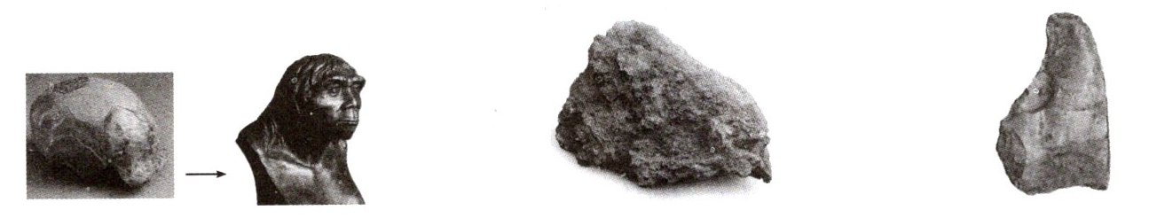 |图1 北京人头盖骨化石和复原头像|图2 北京人用火灰烬遗存|图3 北京人使用的石器|