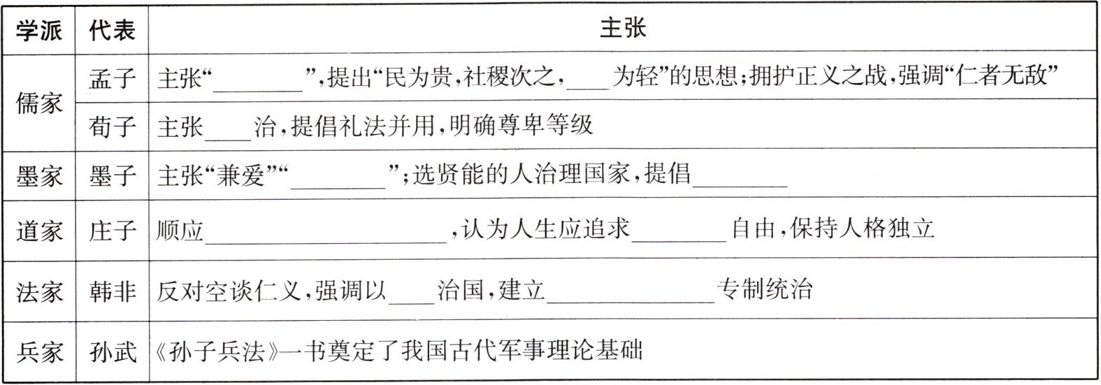 (2)孟子继承和发展孔子学说:①主张实行“仁政”;②提出“民为贵,社稷次之,君为轻”的思想;③反对一切非正义的战争。