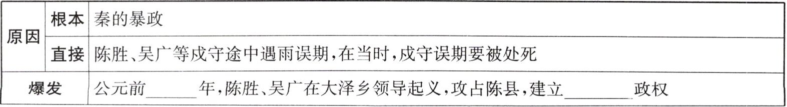 |爆发|公元前______年,陈胜、吴广在大泽乡领导起义,攻占陈县,建立______政权|