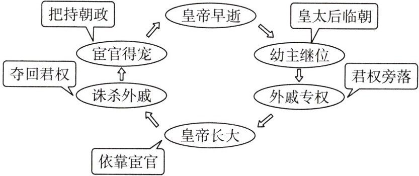 (1)政治局面:外戚与宦官交替专权。原因:皇帝早逝,幼主继位,太后临朝,外戚专权;皇帝长大后依靠宦官夺回君权,宦官得宠把持朝政。