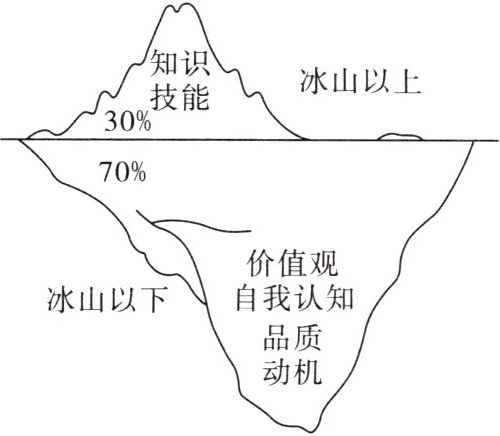 5. 心理学中通常使用冰山模型(右图所示)来表现对人的认知,将人的个体素质和能力划分为冰山以上部分和冰山以下部分。冰山以下部分是人内在的、难以测量的部分,不易因外界影响而改变,却起着关键作用。冰山模型说明(