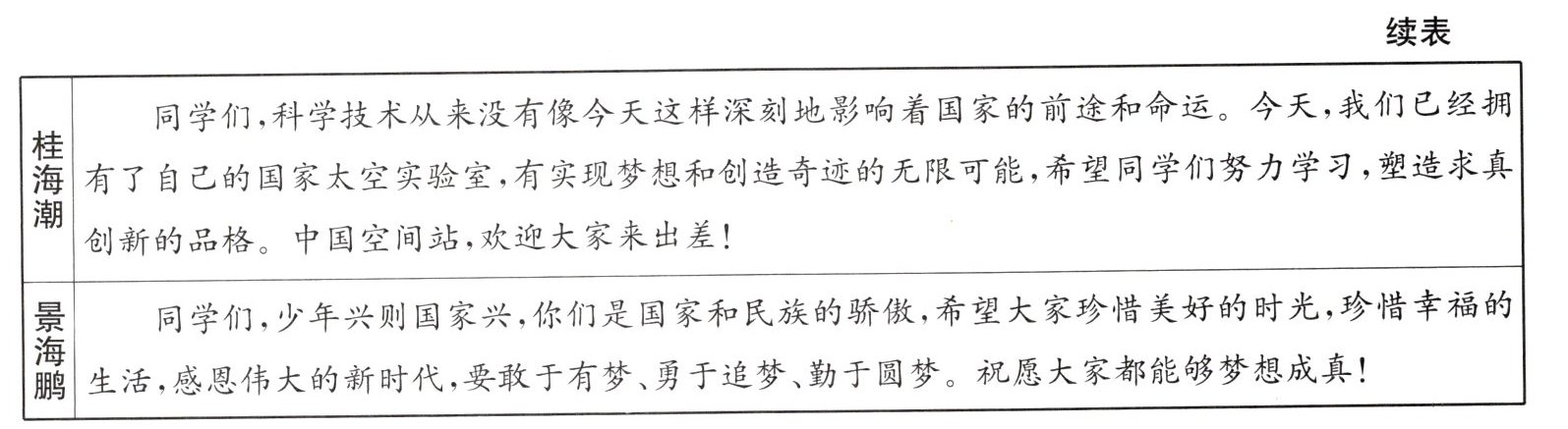 材料二 2023年9月21日下午,“天宫课堂”第四课在中国空间站开讲,新晋“太空教师”景海鹏、朱杨柱、桂海潮为广大青少年带来一场精彩的太空科普课,这是中国航天员首次在梦天实验舱内进行授课。在课程尾声,神舟十六号的三名航天员寄语广大青年学生:
