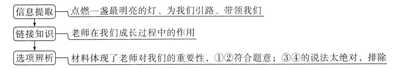 【典型例题】 有的老师,在我们身处黑暗时,为我们点燃一盏最明亮的灯;有的老师,在我们迷茫时,为我们引路;有的老师,在我们懵懂时,带领我们在知识的海洋里畅游……对此认识正确的有( )。