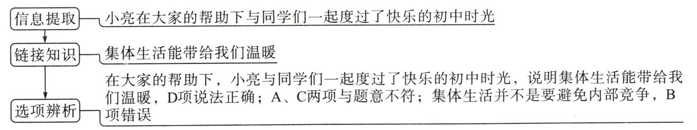 【典型例题】(2023·广东中考)为了帮助因先天性疾病而无法行走的小亮同学,全班同学组成互助小分队,男生负责背他上下楼,女生负责帮他背书包。在大家的帮助下,小亮与同学们一起度过了快乐的初中时光。这让我们体会到( )。