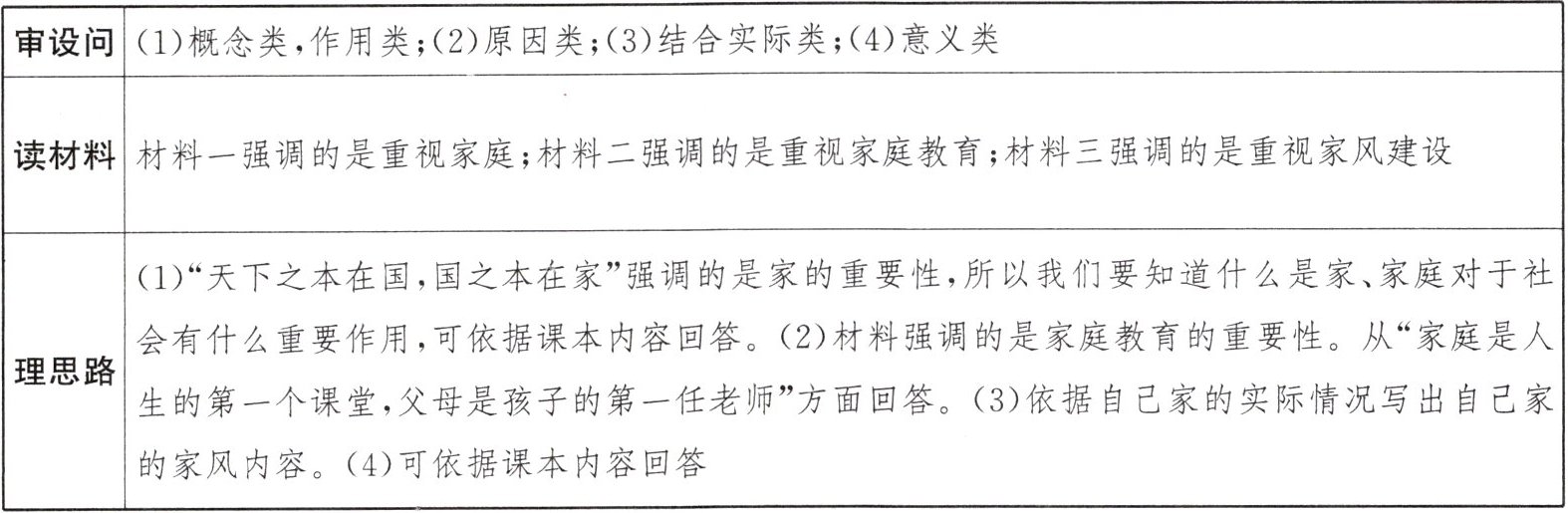 【典型例题1】 有家才有国,有国才有家,小家连着大家、连着国家。家庭的事不仅仅是我们个人的事,也是国家的事、社会的事。这就是我们中国人千百年来传承至今的特有的家国情怀。让我们根据三则材料,一起来探讨有关家庭、家教和家风的问题。