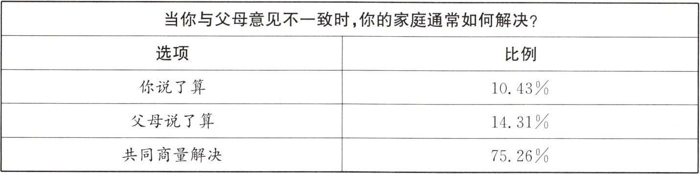 材料一 某校开展了以“建设和谐家庭”为主题的问卷调查。下表是其中一个问题的调查统计结果。