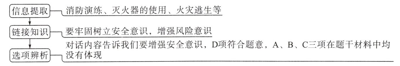 探究思考 为了提高学生的安全意识,构建和谐校园,为学生的健康成长撑起一片蓝天,某校组织开展了“安全教育宣传周”活动。教师充分利用班会、道德与法治课等,对学生进行安全知识普及。安全教育内容涵盖防火、防震、防溺水、交通安全等方面,让学生牢固树立安全意识,增强风险意识。同时,学校组织了一次安全疏散演练活动,让学生在实践中学会保护自己。