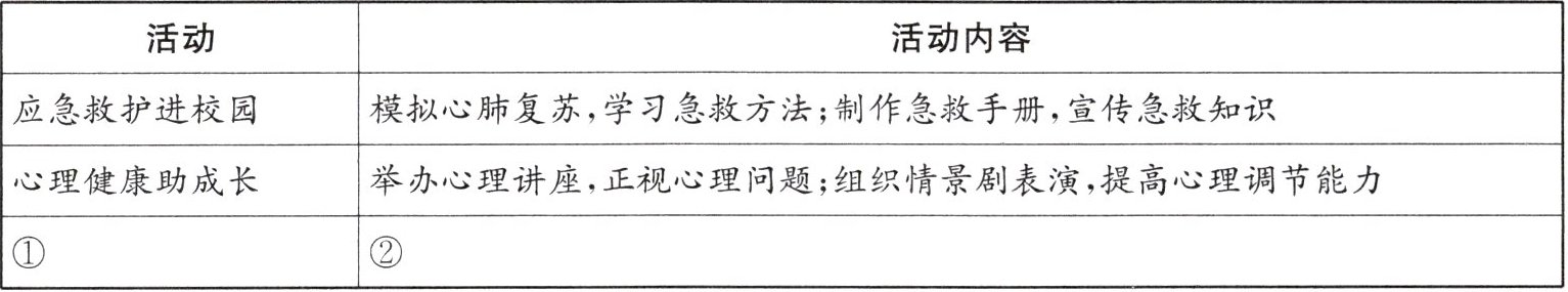 (1)结合材料,想一想学校还可以举办哪些活动,把①②补充完整。