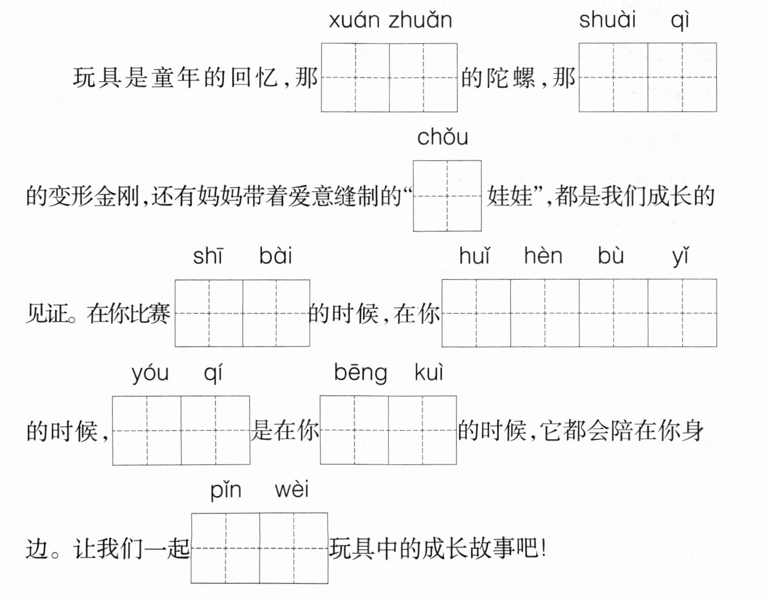 【分享会开场语】看拼音,帮小天在田字格中写出正确的字词。