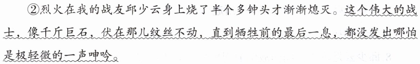 ①我的心紧缩着,我担心这个年轻的战士会实在忍耐不住突然跳起来,或者突然叫出声来。我几次回过头来,不敢朝他那儿看,不忍看着我的战友被活活烧死,但是我又忍不住不看。我心里像刀绞一般,眼泪模糊了我的眼睛。