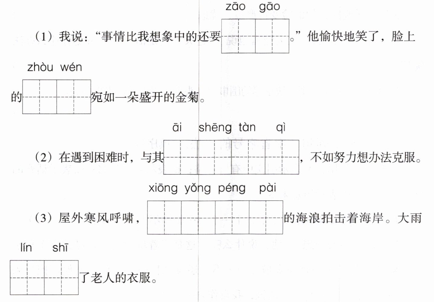 【答案】:勉强(qiǎng√) 唉(āi√)声叹气 自作(zuò√)自受