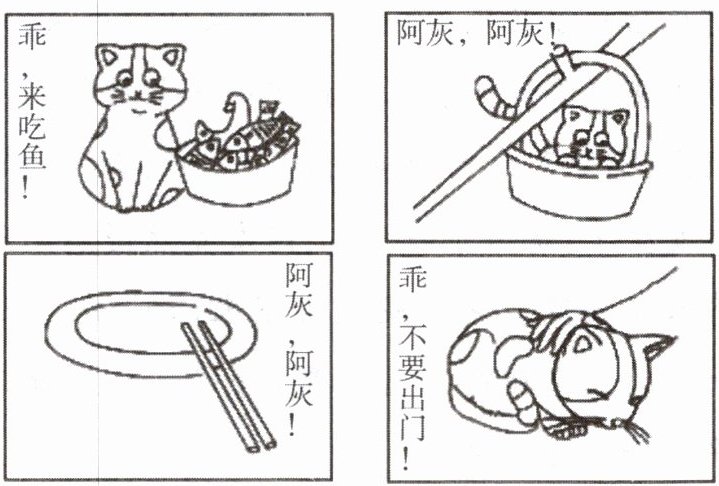 10. 小瓯展示了简笔小漫画。请你根据文章内容,帮忙补全(1)(4)两处。