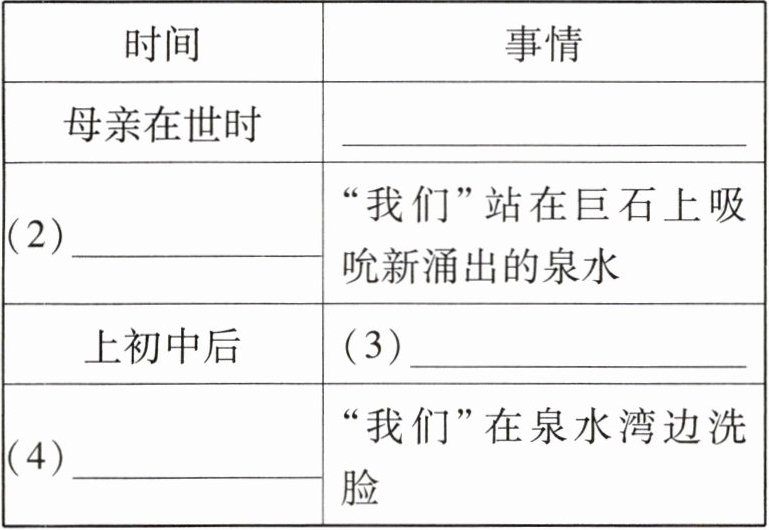 8. 本文围绕“泉水”写了不同时期的四件事,请填写下面表格。