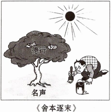 内容:画面中太阳下有一棵树,树冠上写着“德行”,树影上写着“名声”,树下一个人拿着刷子刷地,努力扩大树影面积。寓意,德行如树,名声如影。德行高尚,名声才能响亮,做人若只思着扩大名声,不重视德行,是舍本逐末(意对即可)