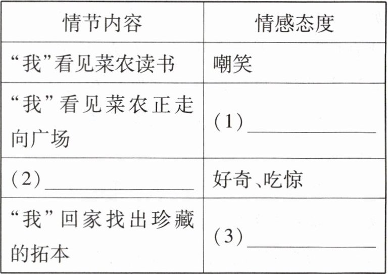 (3)愧疚 14.通过描写其他人的活动,如玩手机、拉家常、东张西望等,与菜农自顾自默读形成鲜明对比,突出菜农在喧闹环境中坚守内心宁静的特点。 15.“娴熟”意思是老练、熟练或灵活,形容菜农挥动拖把写字的动作熟练。这个词生动地表现出菜农书法技艺的高超,体现出他在练字方面下了很多功夫。 16.①作为文章线索,贯穿全文,使文章结构严谨;②揭示文章主旨,表现菜农在世俗的喧嚣中坚守内心宁静的品质;③富有文化内涵,吸引读者阅读兴趣。
