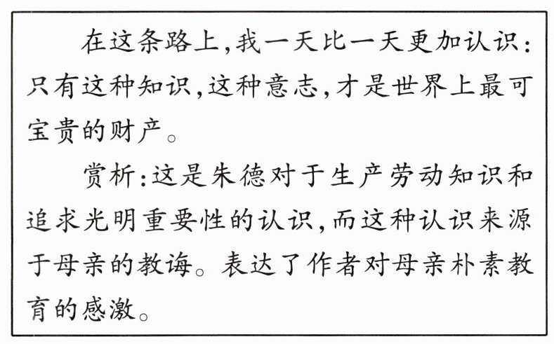 8.B(B."直接批评"的表达不妥当,第⑫段由"周总理表示要逐步解决这个问题""当周总理知道一九五三年从师大戏剧系毕业的青年演员,每月工资七十多元的时候,笑了笑"可知,"是不是太多了"以问句形式暗示工资水准应该降低一些,并非直接批评。) 9.内心的动荡不平 对青年演员们影响、意义之大。 10."簇拥"写出青年演员们对周总理的尊敬与爱戴,青年演员们深夜陪伴周总理散步回宿舍的和谐场景,表现了周总理平易近人,表达了作者对周总理的尊敬和赞美。 11.前半部分的语言描写简短,口语化,体现了周总理和蔼可亲、平易近人的特点,也表现了青年演员们对周总理的尊敬与爱戴;后半部分以周总理大量的话语为主,篇幅较长,书面化,体现了场合的庄重严肃,突出了周总理的领袖身份,表现了对青年演员们的期望、鞭策。