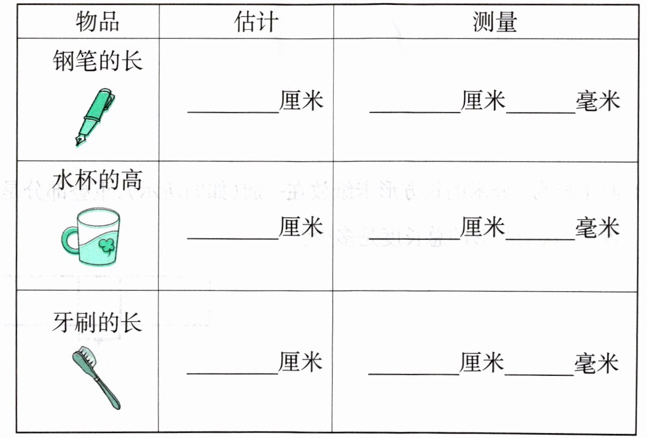 解析:本题考查长度单位厘米和毫米的实际运用与估测。通过实际观察和测量身边物品的长度,培养对长度单位的感知和运用能力。