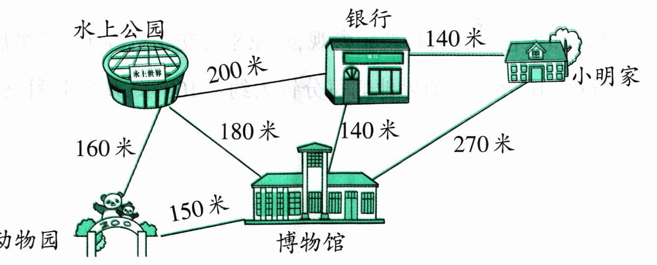 (3)小明从家经过银行到水上公园一共要走多少米?