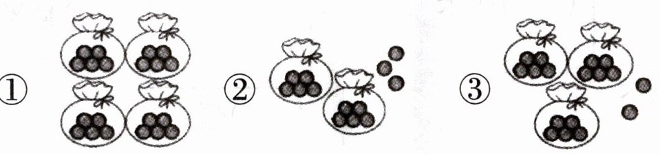 图③:每个袋子里有5个球,有3个袋子,另外还有2个球,算式为$3×5+2$。