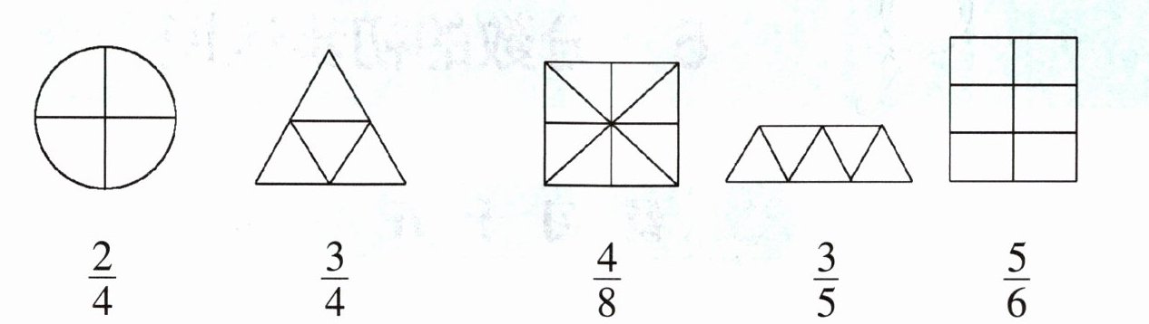 $\frac{2}{4}$ $\frac{3}{4}$ $\frac{4}{8}$ $\frac{3}{5}$ $\frac{5}{6}$