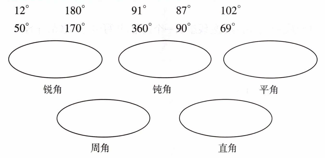 锐角______ 钝角______ 平角______ 周角______ 直角______