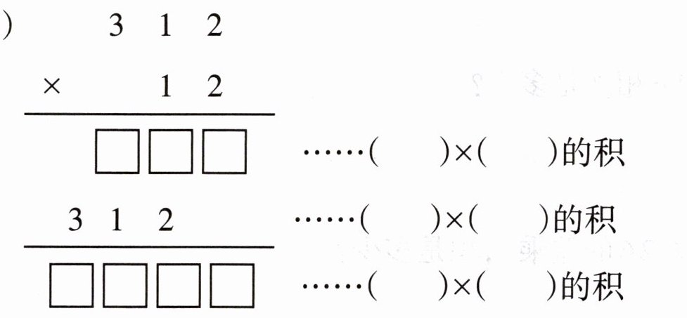 解析:本题考查三位数乘两位数的竖式计算中每一步所代表的意义。在$312×12$的竖式计算中,$312$是$312$乘$12$个位上的$2$得到的积;下面一行$312$是$312$乘$12$十位上的$1$(表示$10$)得到的积,也就是$312×10$的积。