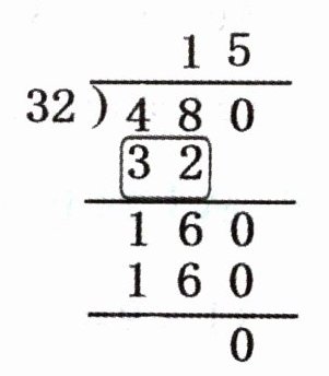 $\begin{array}{r} 15\\ 32\enclose{longdiv} {480}\\ \boxed{32}\\ \hline 160\\ 160\\ \hline 0\end{array} $