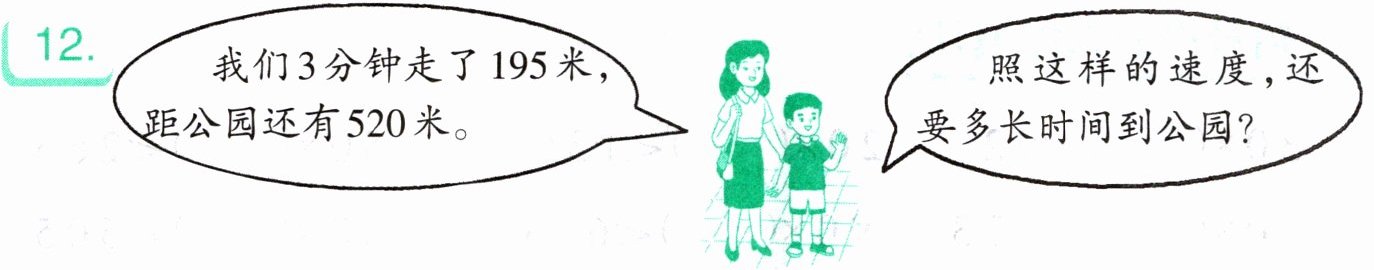 首先根据“$速度 = 路程÷时间$”求出速度,已知$3$分钟走了$195$米,所以速度为$195÷3 = 65$(米/分钟)。