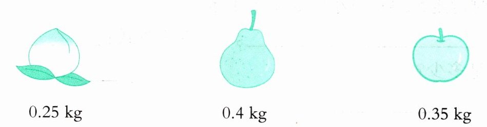 故答案依次为:(1)$1.5$kg;(2)$5.2$kg;(3)问题:$5$个苹果共多少千克?$0.35×5 = 1.75$(kg)(答案不唯一)。