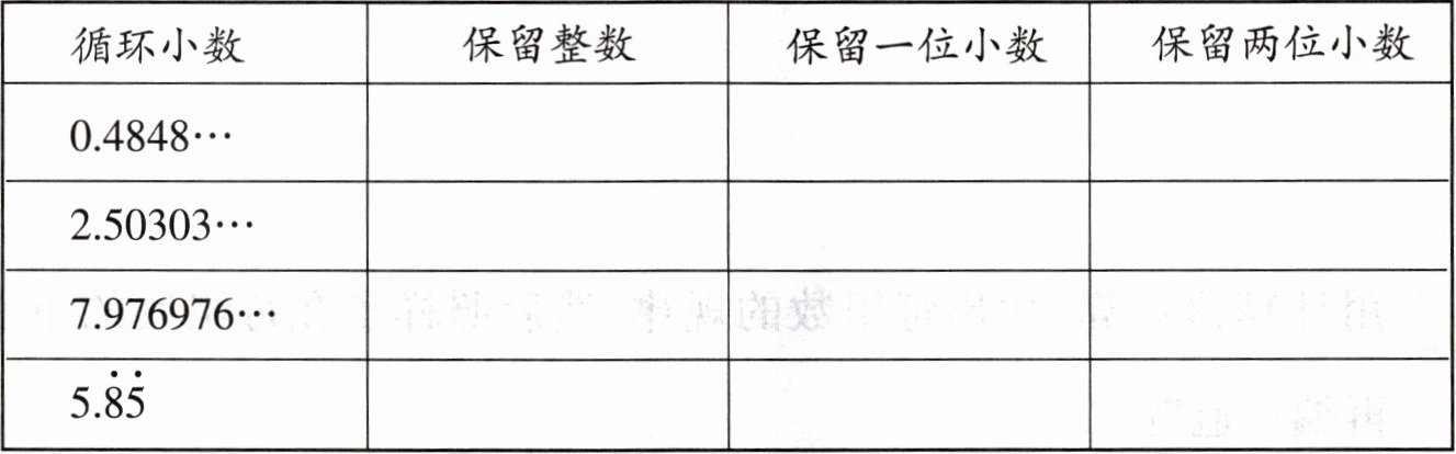 | 循环小数 | 保留整数 | 保留一位小数 | 保留两位小数 |