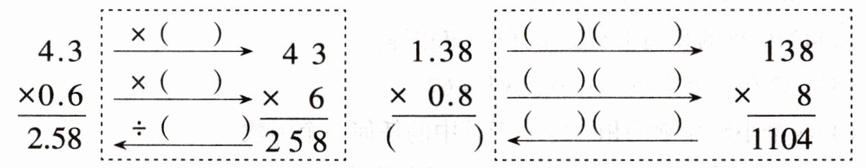 )来计算。$\begin{array}{r} 4.3\\ ×0.6\\ \hline 2.58\end{array} \begin{array}{r} \xrightarrow []{×(10)}43\\ \xrightarrow []{×(10)}×6\\ \xleftarrow []{÷(100)}258\end{array} $
