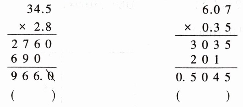 应先按照整数乘法算出$345× 28$的积是$9660$,因为因数中一共有$2$位小数,所以要从积的右边起数出两位,点上小数点,即$96.60$,末尾的$0$可以去掉,结果是$96.6$,原计算没有点小数点。